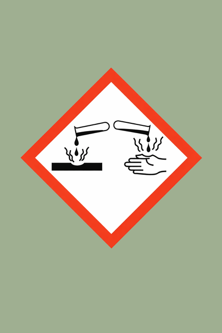 Dette ætsende stof advarselsskilt klistermærke viser det velkendte faresymbol for ætsende kemikalier. Symbolet forestiller væske, der hældes fra to beholdere og ætsende dråber som påvirker både en overflade og en hånd. Det er en del af de internationale GHS-faresymboler som bruges til at advare om farlige kemikalier.