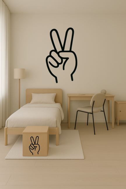 Motivet med to fingre i vejret er et ikonisk symbol på fred, fællesskab og balance, perfekt på døren, spejlet eller din computer. Stickeren er udskåret i folie som holder sig flot indendørs og er nem og montere.